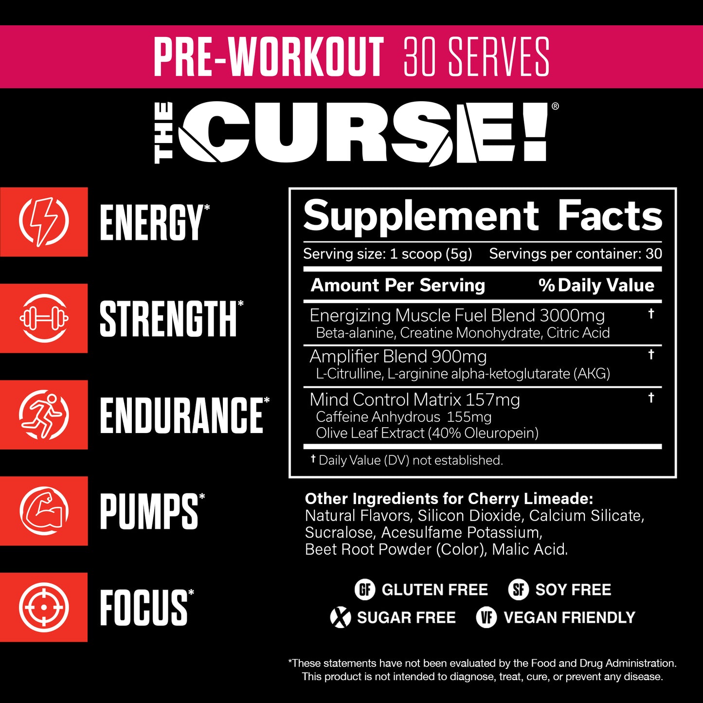 - Maximum Pumps: Formulated with L-Citrulline and L-Arginine, powerful nitric oxide boosters, The Curse! Pre Workout supports improved vascular blood flow and delivers a hard-hitting pump.