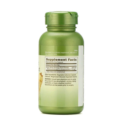 Each capsule contains 500 mg Korean White Ginseng root extract standardized to provide 3 percent Ginsenosides (15 mg). Supports vitality and overall well-being. Supports mental alertness, concentration and maintain a sharp mind. Helps to enhance vitality and energy. Suitable for vegetarian.
