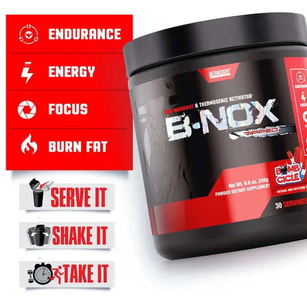 ✔ 3-In-1 Pre Workout Formula - Strategically formulated to target 3 key desires of any exercise routine focused on lean muscle growth. B-NOX Ripped supplies key fat burning ingredients with endurance enhancing and explosive energy nutrients to maximize one’s workout.