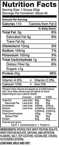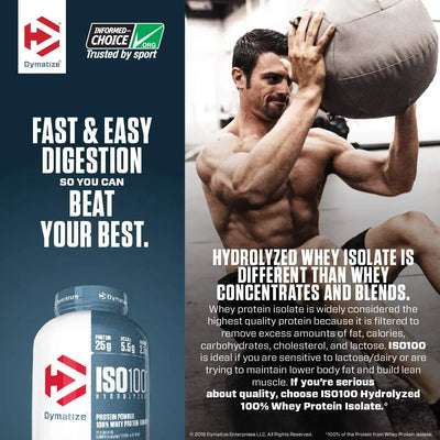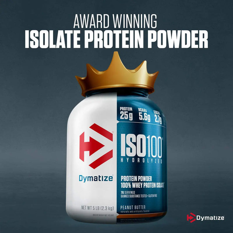 Iso-100, the ultimate zero carb whey protein that actually tastes good. Dymatize iso-100 derives its name from its protein source, 100 percent whey protein isolate. Unless you are in the medical profession, you have probably never seen protein like this before. Most companies "claim" they use whey protein isolate, but after one serving of dymatize ISO 100 you can instantly see, taste and even feel the difference. Our whey protein isolate has been processed to the zenith of perfection, 100 percent hydrolysed and instantized and taken through no less than 5 quality controlled steps. Both lactose and fat have been removed from iso-100, leaving you with nothing but the most easily digested, assimilated and most bio-available source of protein on the market. We know that maximum protein utilization is essential to aiding muscle recovery and maintaining a positive nitrogen balance, which is critical during periods of intense training. There is no higher standard of protein than iso-100, so feel confident that you will be feeding your muscles to their fullest potential. Check the stats, each serving has an astonishing 24 grams of protein, with "0" carb and "0" fat. Look closer. You will see that all this is in a serving size of about 28 grams, making iso-100 90 percent protein by weight. Nothing out there matches our formula, nothing even comes close. The meticulous processing of dymatize whey protein isolate gives you "instant mixability" in its true form. You won't believe how quickly dymatize iso-100 goes into solution. And, because of its ultra-purity and zero lactose, dymatize iso-100 could be the easiest protein to digest on the market today. Don't forget, with zero carbohydrates, dymatize iso-100 is perfect for low carb diets.