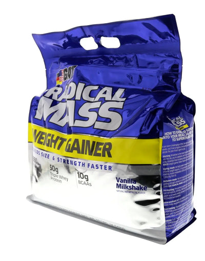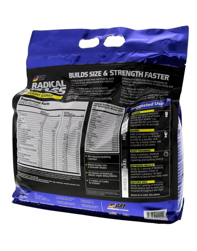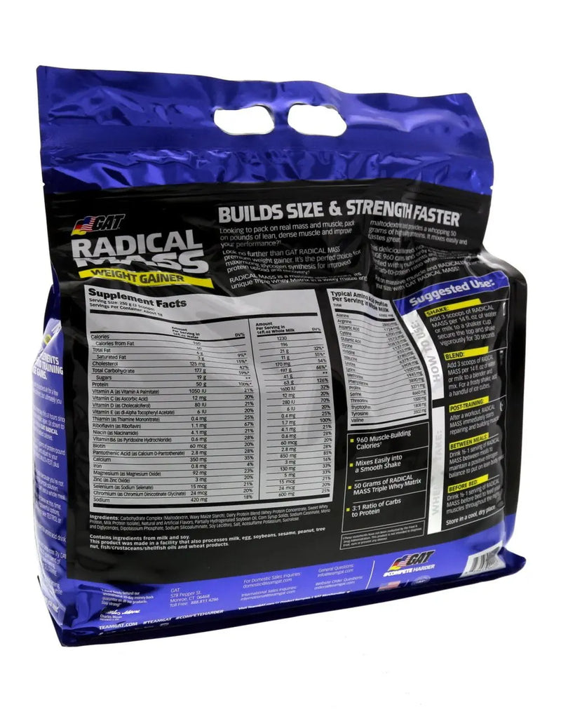 Gat radical mass is a premium weight gainer delivering a huge 960 calories* and only 6 grams of fat per serving without sacrificing a deliciously rich milkshake flavour. Fortified with key nutrients and electrolytes in a 3:1 carb-to-protein ratio providing 50 grams of high-quality proteins from our own triple-whey matrix. Gat radical mass is a perfect choice for helping to maximize glycogen synthesis for improved protein upload and recovery. Gat radical mass will help pack on size and solid muscle to improve your performance.*