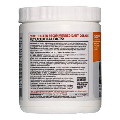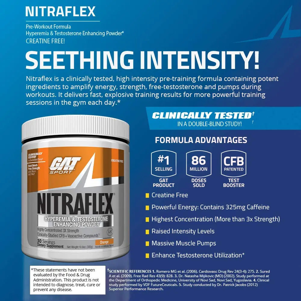 This clinically tested, high-intensity pre-training formula has potent ingredients to help magnify energy, alertness, strength, stamina, pumps, and free testosterone during workouts.* Nitra flex pre-workout delivers fast, explosive training results for a more powerful body, including energy, stamina, nitric oxide (no), and testosterone levels.* It contains proven muscle building l-citrulline malate, l-arginine, l-arginine alpha-ketoglutarate (akg) amino acids, and calcium fructoborate (cfb), a natural, high potency form of boron that has been shown to support free testosterone.*