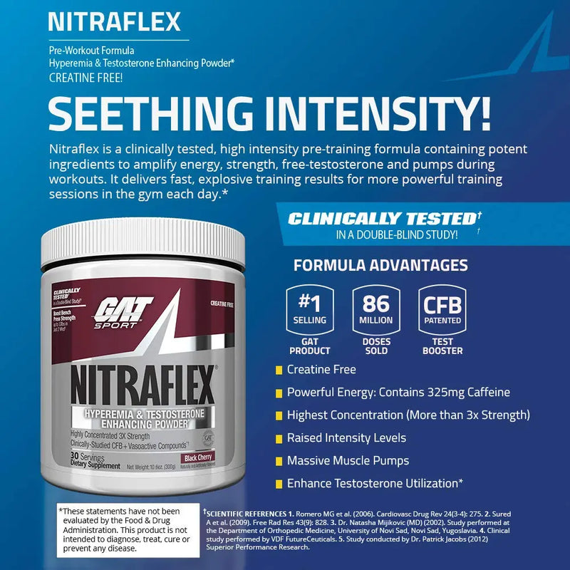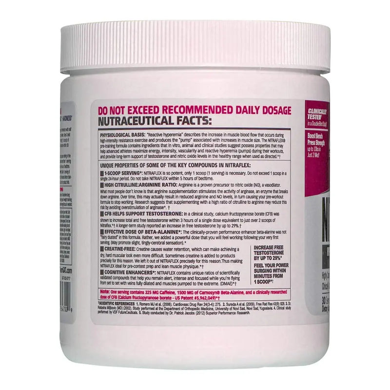 This clinically tested, high-intensity pre-training formula has potent ingredients to help magnify energy, alertness, strength, stamina, pumps, and free testosterone during workouts.* Nitra flex pre-workout delivers fast, explosive training results for a more powerful body, including energy, stamina, nitric oxide (no), and testosterone levels.* It contains proven muscle building l-citrulline malate, l-arginine, l-arginine alpha-ketoglutarate (akg) amino acids and calcium fructoborate (cfb), a natural, high potency form of boron that has been shown to support free testosterone.*