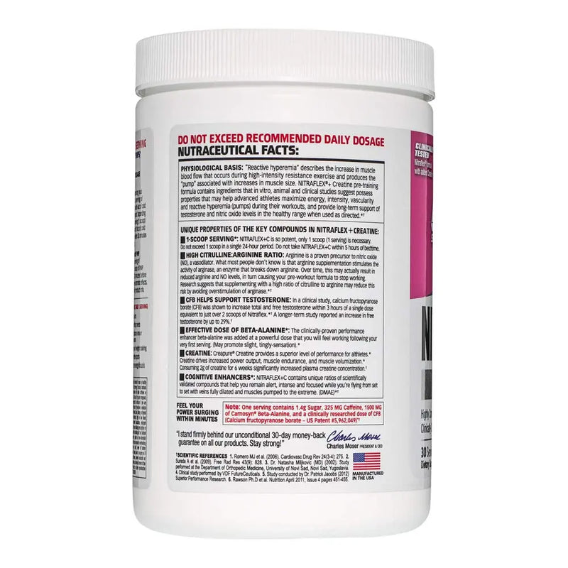Nitra flex+ creatine pre-training formula contains ingredients that in vitro, animal and clinical studies suggest possess properties that may help advanced athletes maximize energy, intensity, vascularity, and reactive hyperemia (pumps) during their workouts, and provide long-term support of testosterone and nitric oxide levels in the healthy range when used as directed. *