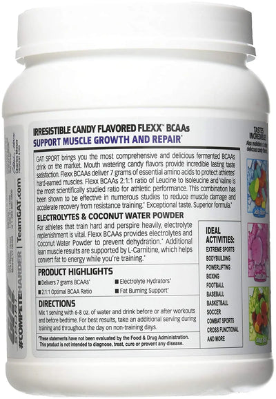 The gat sports team has achieved in bringing you the most delicious fermented bcaas drinks on the market yet. Mouth watering, candy avers provide incredible taste satisfaction. Flex bcaas deliver 7 grams of essential amino acids to protect athletes' hard-earned muscles. Flex bcaas 2:1:1 ratio of leucine to isoleucine and valine is the most scenically studied ratio for athletic performance. It has been shown to be effective in numerous studies to reduce muscle damage and accelerate recovery from resistance training. For athletes that train hard and perspire heavily, electrolyte replenishment is vital. Flex bcaas provides electrolytes and coconut water powder to prevent dehydration. Exceptional taste. Plant-based bcaas.