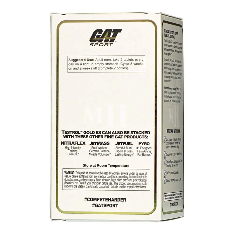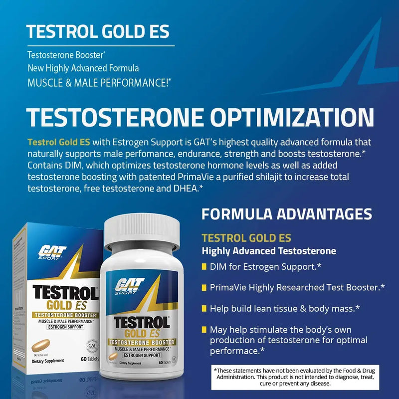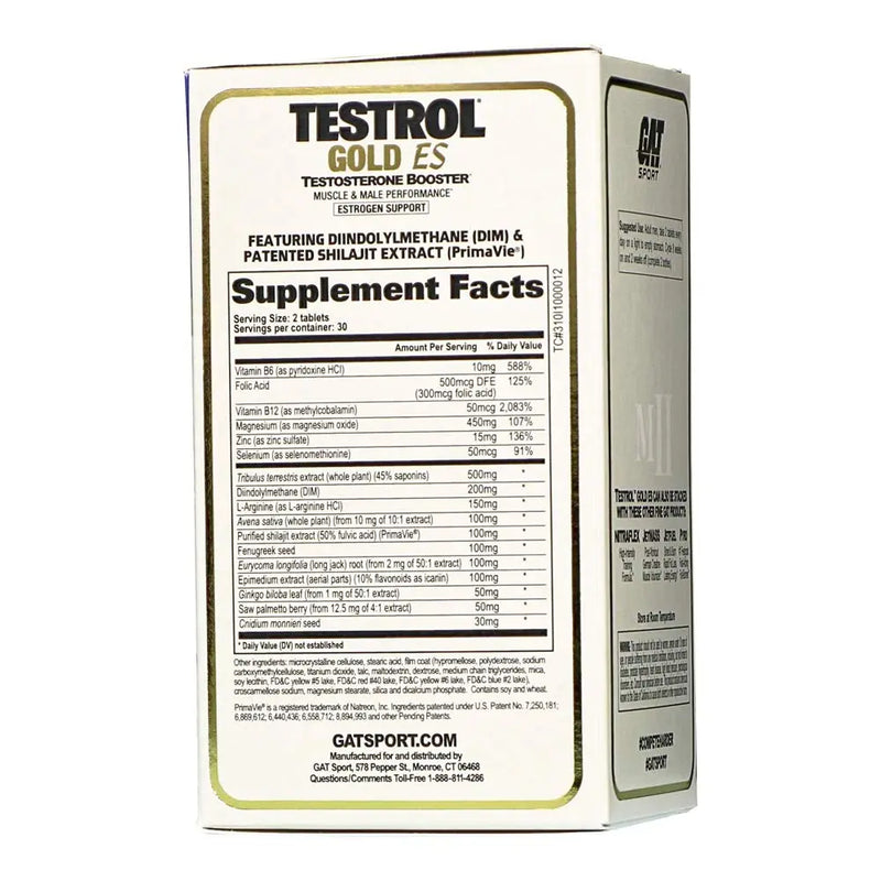 Testrol gold es is gat's specialty men's testosterone booster. This advanced formula naturally supports male performance, endurance, strength, and testosterone, with the added benefit of hormone regulators.* Contains dim, short for 3,3'-diindolylmethane, a compound from indole-3-carbinol (i3c), a phytonutrient that offers estrogen balance support for men.* Dim supports the activity of specific enzymes that support normal estrogen ratios that optimizes testosterone hormone levels.* Added testosterone boosting:?ÿprimavie, a high quality, clinically proven, shilajit mineral deposit from the Himalayas. Studied to increase total testosterone, free testosterone, and DHEA.*