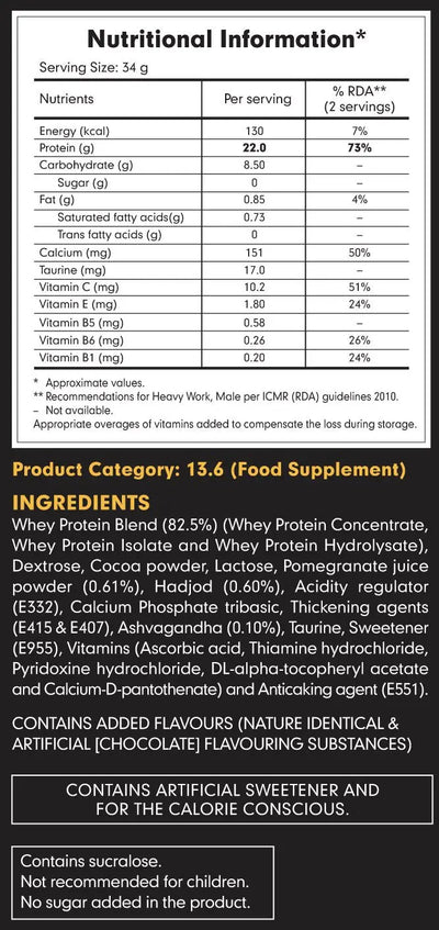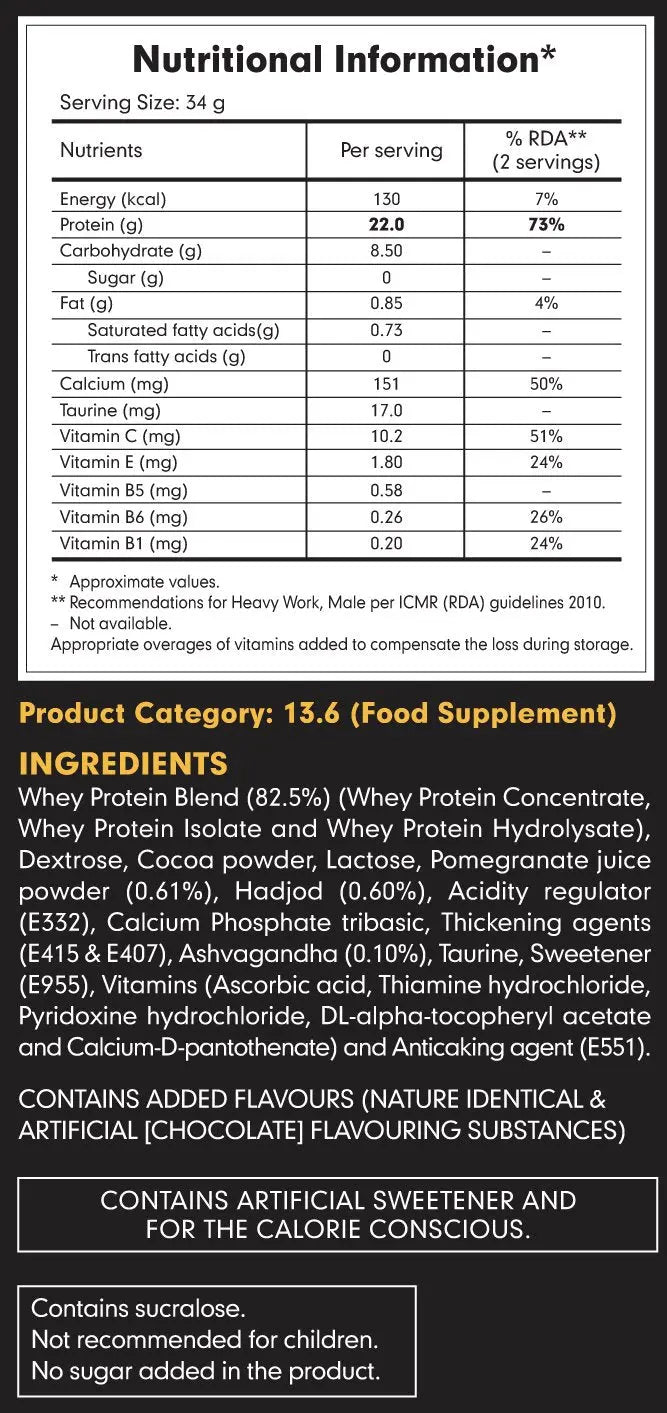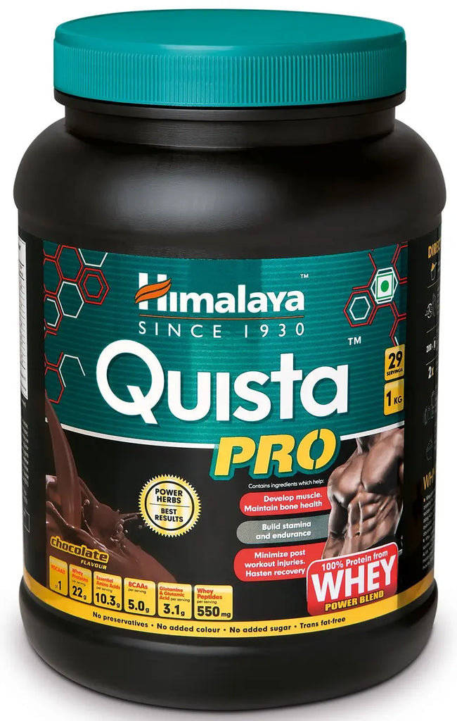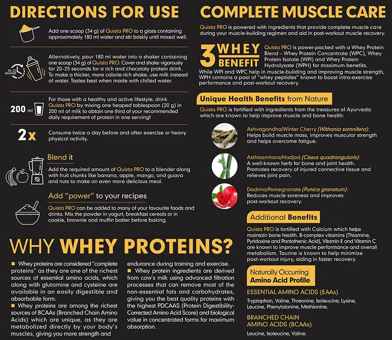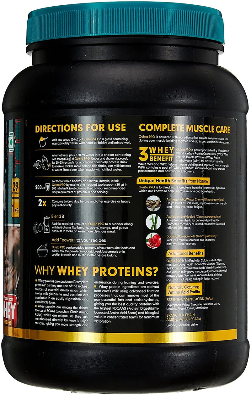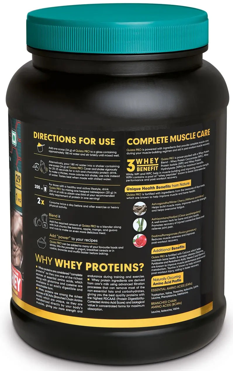 Quista pro is a whey protein blend that helps gain muscle mass. It is among the first protein blend that contains all 3 forms of whey (WPC, WPI, WPH) in one for maximum benefits. What sets it apart, is that Quista Pro is enriched with botanical ingredients like Ashvagandha, Asthisamhara and Dadima (Pomegranate) that helps improve muscle and bone health. It has the balanced blend of high quality proteins and nutrients like vitamins, minerals, taurine, calcium that can be suitably consumed with water or milk. Quista Pro comes in the most globally loved flavour, which is the chocolate flavour. All the competitive sports people aiming for overall muscle health should mix 1 scoop (34g) in 180 ml water preferably, post work out. Active lifestyle and fitness oriented people can also benefit from Quista Pro by consuming 1 heaped tablespoon (20g) in 200ml milk once a day.