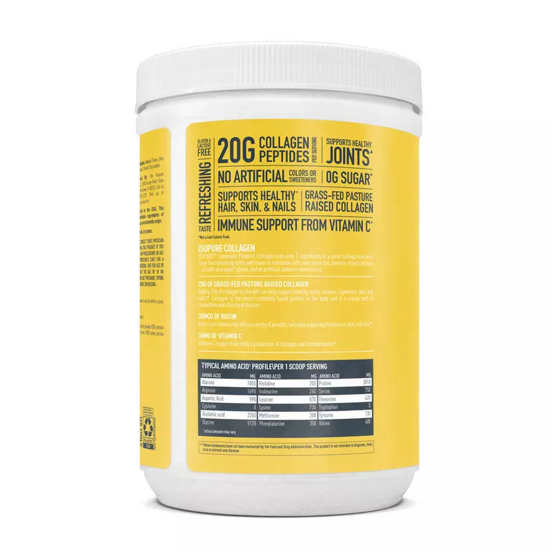 ISOPURE® Collagen Peptides provides support for healthy joints, hair, skin, and nails + immune support1 with 20g of grass-fed, pasture-raised collagen, 30mcg biotin, and 36mg vitamin C in a convenient powdered drink mix. True to our “Add less. Do More.” spirit, it contains only as many ingredients as needed with zero sugar,* no gluten or lactose, and no artificial colors or sweeteners. Choose between our refreshing Lemonade flavor with 7 ingredients, and our Unflavored mix with 3 ingredients to boost any flavored beverage, smoothie, or protein shake.