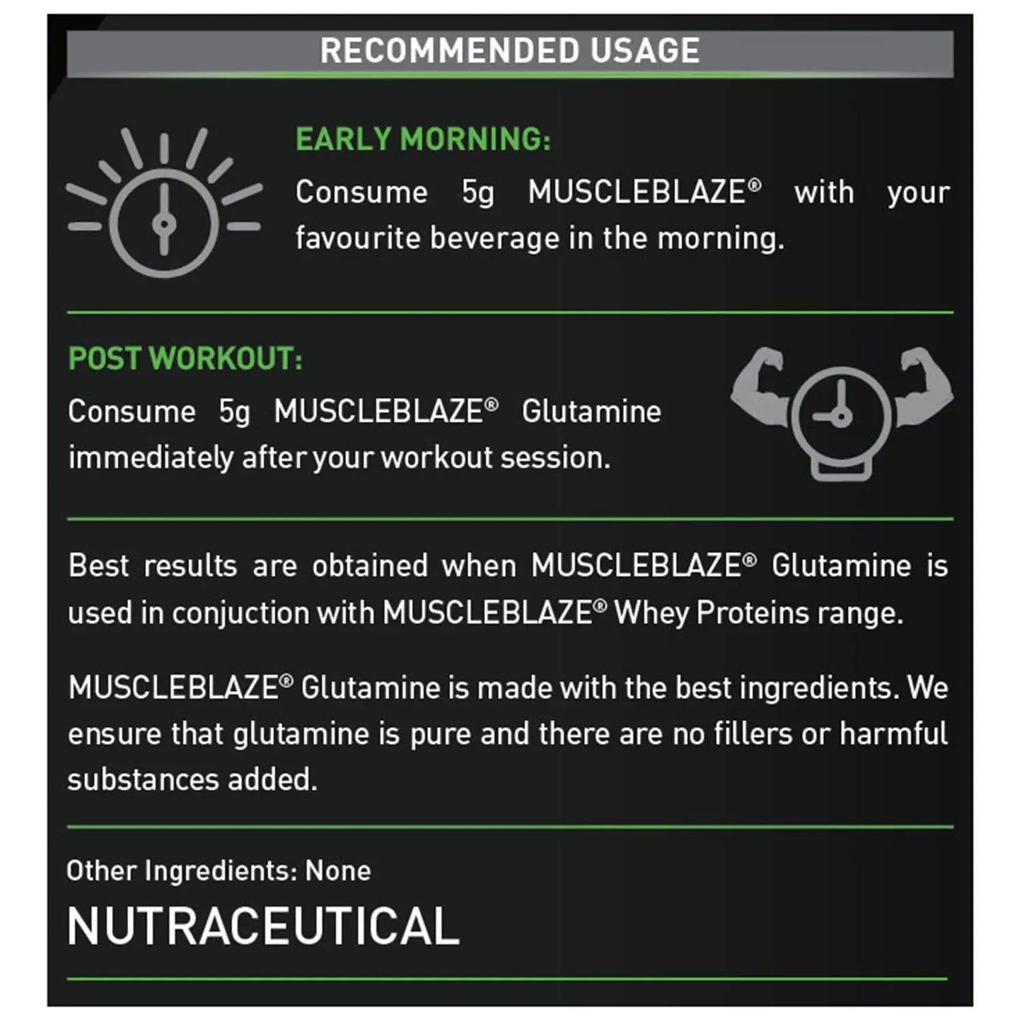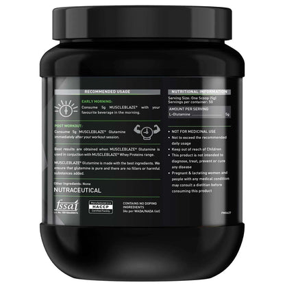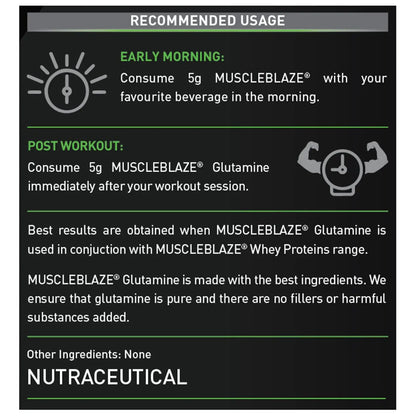 MuscleBlaze Micronized Glutamine, 0.55 lb Unflavoured is a naturally occurring amino acid and prevents the muscles top go into the catabolic stage post intense workout. This health supplement keeps the immune system healthy by fighting free radicals in the body. It also retains the water levels in the cells to eliminate dehydration resulting in fatigue. Micronized Glutamine also repairs the muscle tissues and support protein synthesis. It is also responsible for boosting the production of growth hormone in the body which is essential to gain lean muscle mass.
