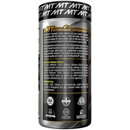 Muscletech Platinum 100 percent Tribulus 90 percent Concentration Double The Potency. Essential Series products are staples for every athlete, with no frills and no fillers - just products you can trust backed by the best brand in sports nutrition!