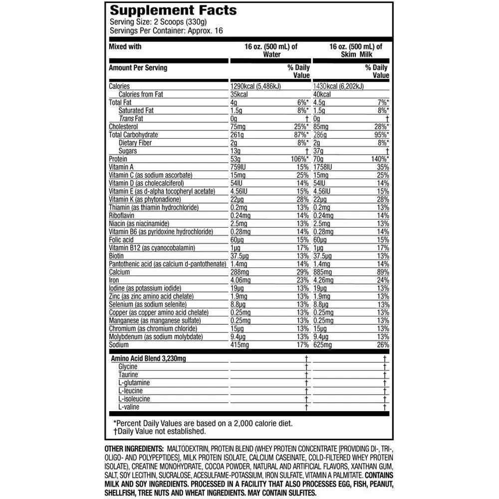 New 100% Premium Mass Gainer is one of the latest innovations from Team MuscleTech America's number 1 selling bodybuilding supplement brand. This power-packed massbuilding formula is an effective way for bodybuilders, strength athletes and hard gainers to get the nutrients and musclebuilding compounds needed to grow bigger and stronger. Not only does 100% Premium Mass Gainer really work, it also comes in two delicious, mouth-watering flavours that'll leave you wanting more. Enjoy All the Benefits of 100% Premium Mass Gainer: Perfect for bodybuilders, strength athletes and hard gainers looking for nutrients to grow bigger and stronger. Delivers additional calories to help meet the unique needs of serious athletes. Formulated with a scientifically validated musclebuilding compound shown in studies to build more muscle size and strength. Accelerates muscle recovery when used to meet your daily protein requirements. Designed to elevate insulin and drive nutrients into muscles for serious gains. Provides essential branched chain amino acids (BCAAs), minerals, glutamine and more. Easy to take any time of day. For best results, take between meals and before bed. Tastes absolutely amazing. Mixes easily in milk or water.