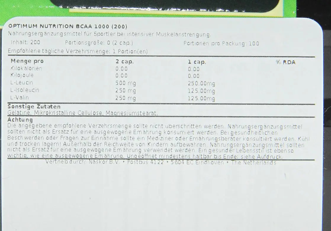 Optimum nutrition BCAA is a dietary supplement containing 1000 mg of branched chain amino acids per serving. Optimum nutrition's BCAA 1000 caps provides a 1000 mg (1 grams) blend of the three branched chain amino acids (L-valine, L-leucineand L-isoleucine)