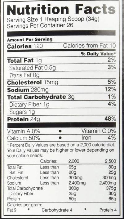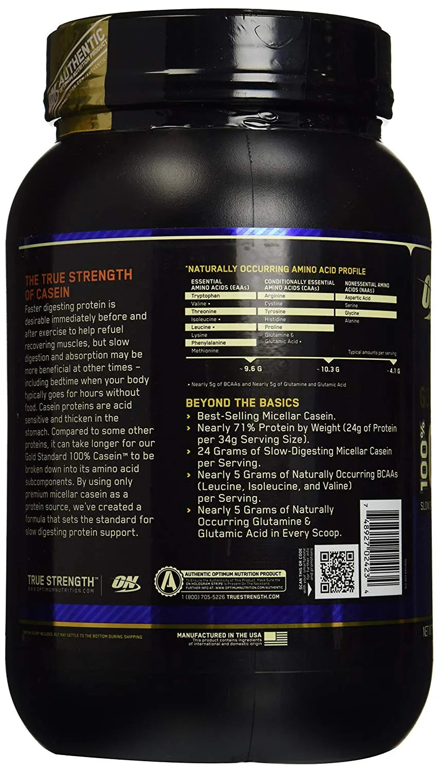 1 g Sugar. 10 g Essential Amino Acids. 100% Micellar Casein. 24 g Protein . 28 Servings. Aminogen Enhanced. Naturally and Artificially Flavored. Slow-Acting Protein.