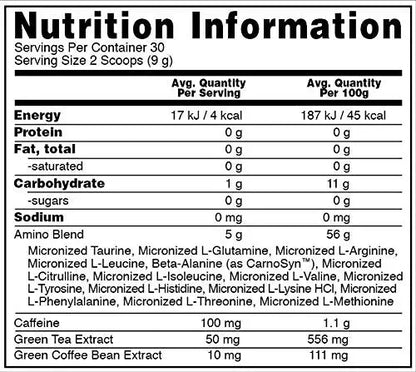 Mix up Essential Amino Energy anytime you want a refreshing fruit flavored boost of energy and alertness. You can determine what's appropriate for any situation, adding a 2-scoop serving to water for an afternoon pick-me-up or increasing the amino acid matrix to 15 grams with a 6-scoop pre-workout strength supplement delivering 300 mg of caffeine from green coffee and green tea extracts. The level of support is entirely up to you.